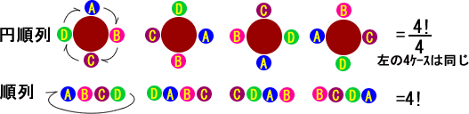 異なるn個のものを、円形に並べる順列の数を求める。・・・・・ 一般式⇒(n-1)!